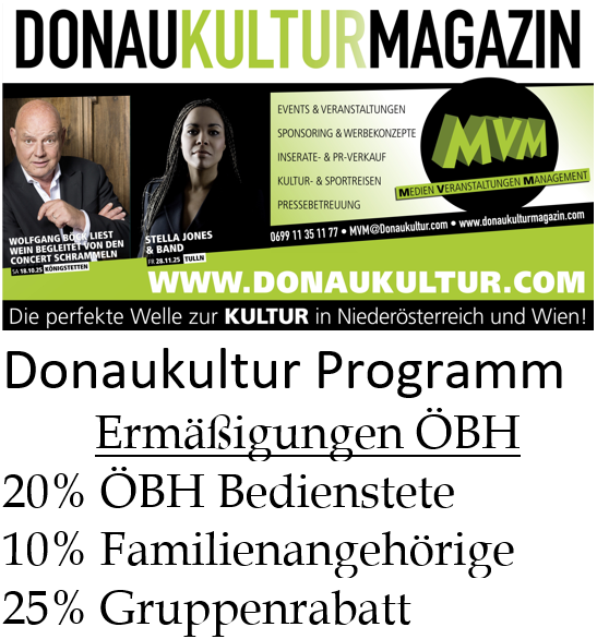 Die Donaukultur KG bietet den Bediensteten des ÖBH sowie den Milizsoldaten auf folgende Veranstaltungen einen Rabatt von 20%, für Familienangehörige einen 10%igen Rabatt, für Gruppen wird ein 25%er Rabatt und für die VIP Karten einen 10%igen Rabatt an.