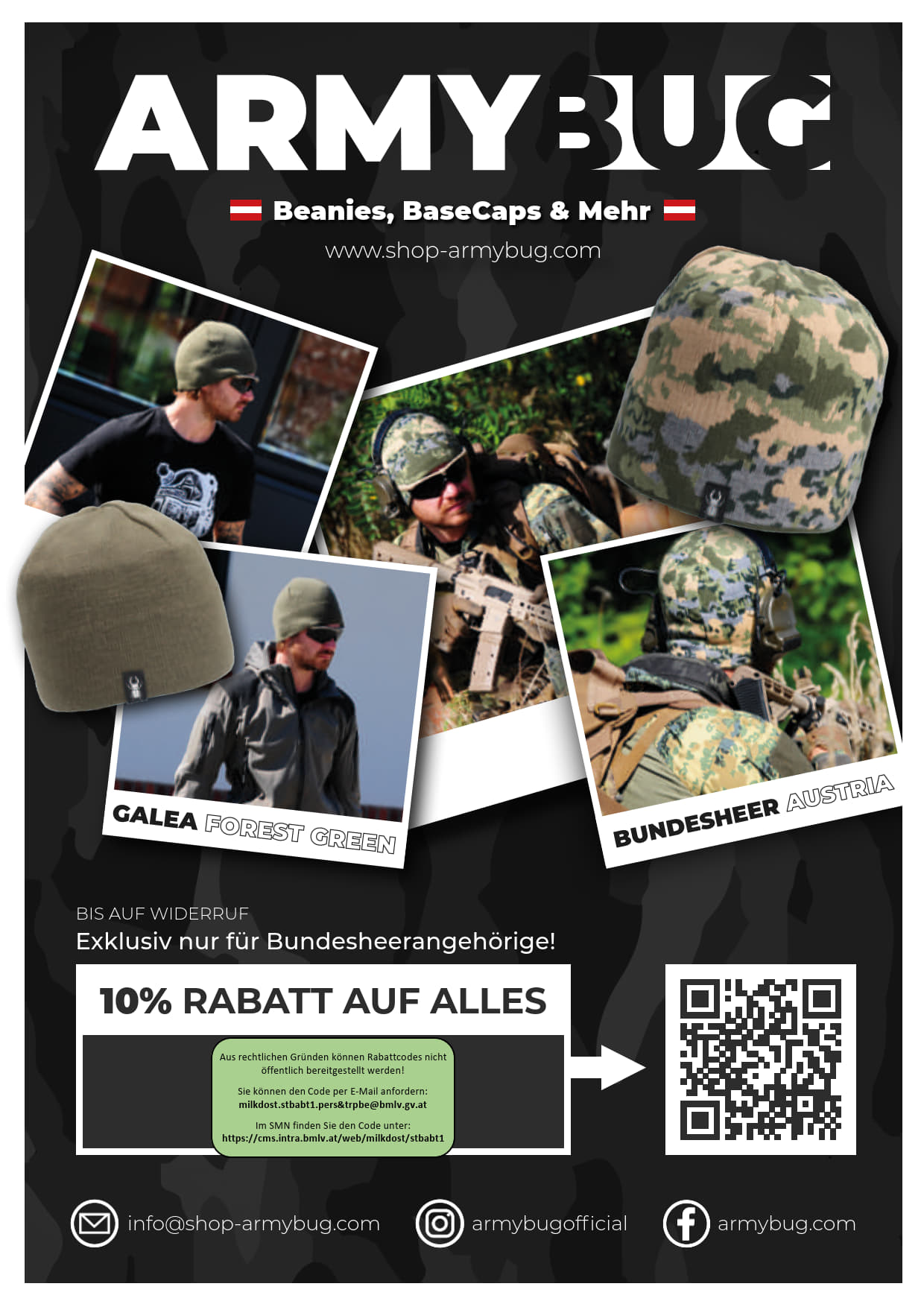 Die Firma invictuslegio bietet allen Bediensteten des Österr. Bundesheeres eine Ermäßigung von -10% auf alle Bestellungen.