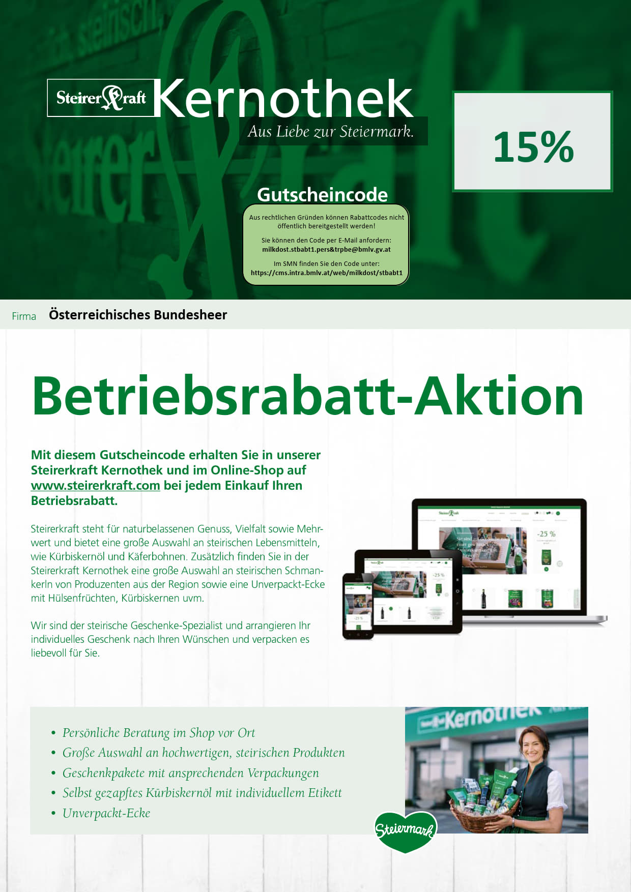 Sonderkondition für das Österreichische Bundesheer:Den hierfür erforderlichen Code finden Sie im SMN unter: https://cms.intra.bmlv.at/web/milkdost/stbabt1oder fordern Sie ihn per E-Mail an unter: milkd ...