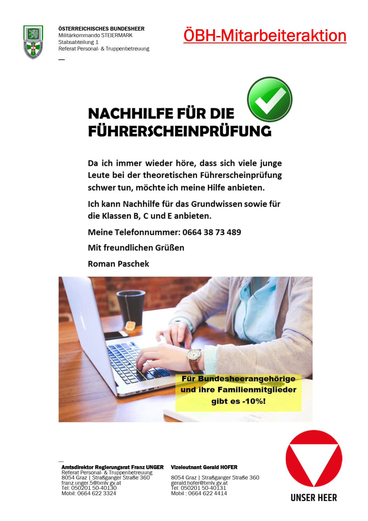 UND SO FUNKTIONIERT´s….Anmeldung ausdrucken, ausfüllen, unterschreiben und eine der folgende Email Adressen schicken : stefan.huemer.4@bmlv.gv.atDas Referat Truppen- und FamBetr/MilKdo OÖ bestätigt dan ...