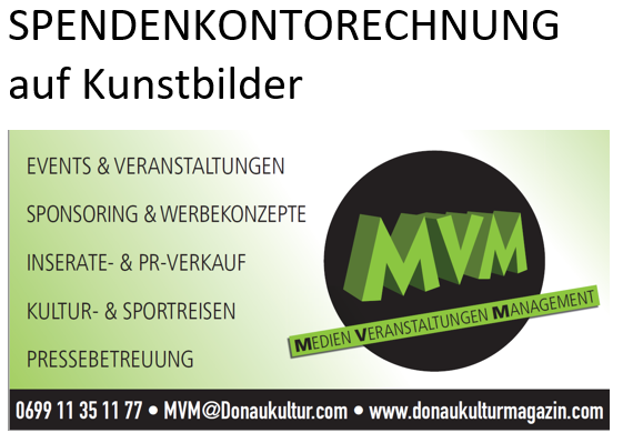 bietet über das Donaukulturmagazin im ONLINE KUNSTKATALOG folgendes an:Beim KAUF eines Bildes wird eine SPENDENRECHNUNG, welche beim BMF (Spenden) geltend gemacht werden kann, ausgestellt.Und so geht’s ...