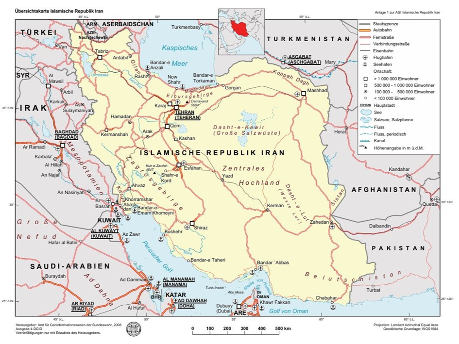 Alle Länderinformationen (Länderbeschreibung, Länderbeschreibung kurz und Karten, Luftaufnahmen zum Iran) kommen vom Institut für militärisches Geowesen.