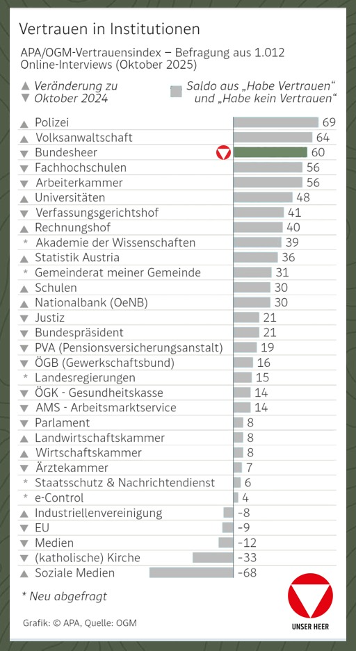 2024 lag das Bundesheer auf Platz 1. Somit ist das Bundesheer seit Jahren in den Top 3 der Institutionen in Österreich.
