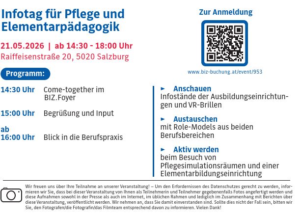 Infotag für Pflege und ElementarpädagogikAm 21. Mai 2026 findet in Salzburg ein informativer und praxisnaher Nachmittag rund um die Berufsfelder Pflege und Elementarpädagogik statt.📍 Ort: Raiffeisenst ...