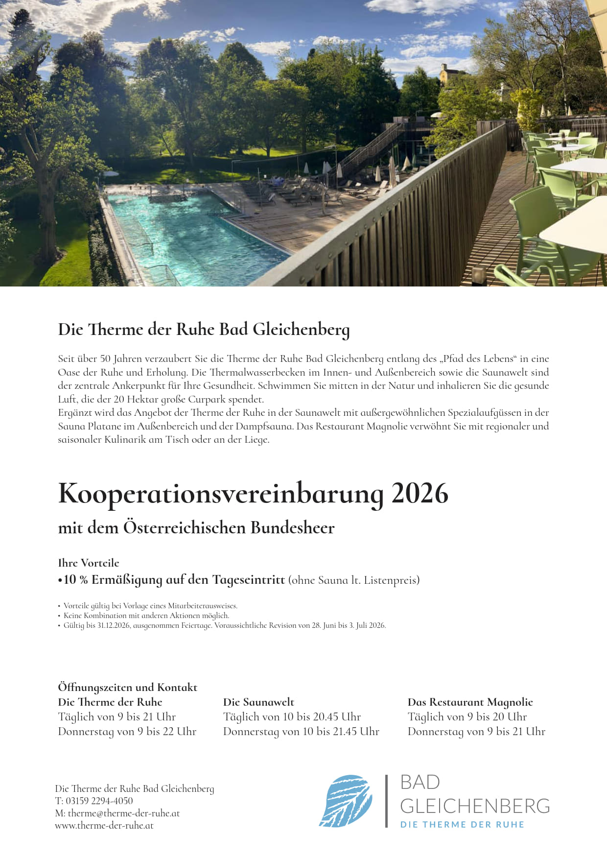 Therme Linsberg Asia in Bad ErlachDie Thermenleitung gewährt allen Heeresbediensteten sowie einer Begleitperson, gegen Vorlage der Dienstkarte eine Ermäßigung von -10% auf den jeweiligen Eintritts-List ...