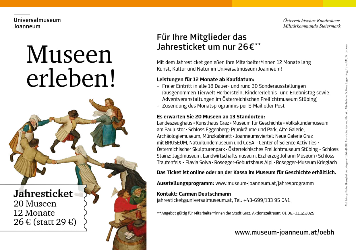 Das Ref TrBe&FamBe informiert über eine Ermäßigungsaktion von -10 % für alle Angehörigen des ÖBH (GWD, Soldaten, Zivilbedienstete und Wehrpflichtige der Miliz) nach Vorweis eines gültigen Dienstaus ...