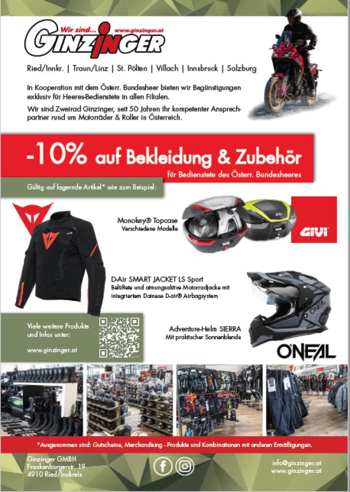 UND SO FUNKTIONIERT´s…..Nach Vorlage des Wehrdienstausweises bzw. des Dienstausweises erhaltet ihr 10% Ermäßigung auf lagernde Bekleidung und Zubehör an allen GINZINGER Stanorten (RIED/Innkreis, TRAUN/ ...