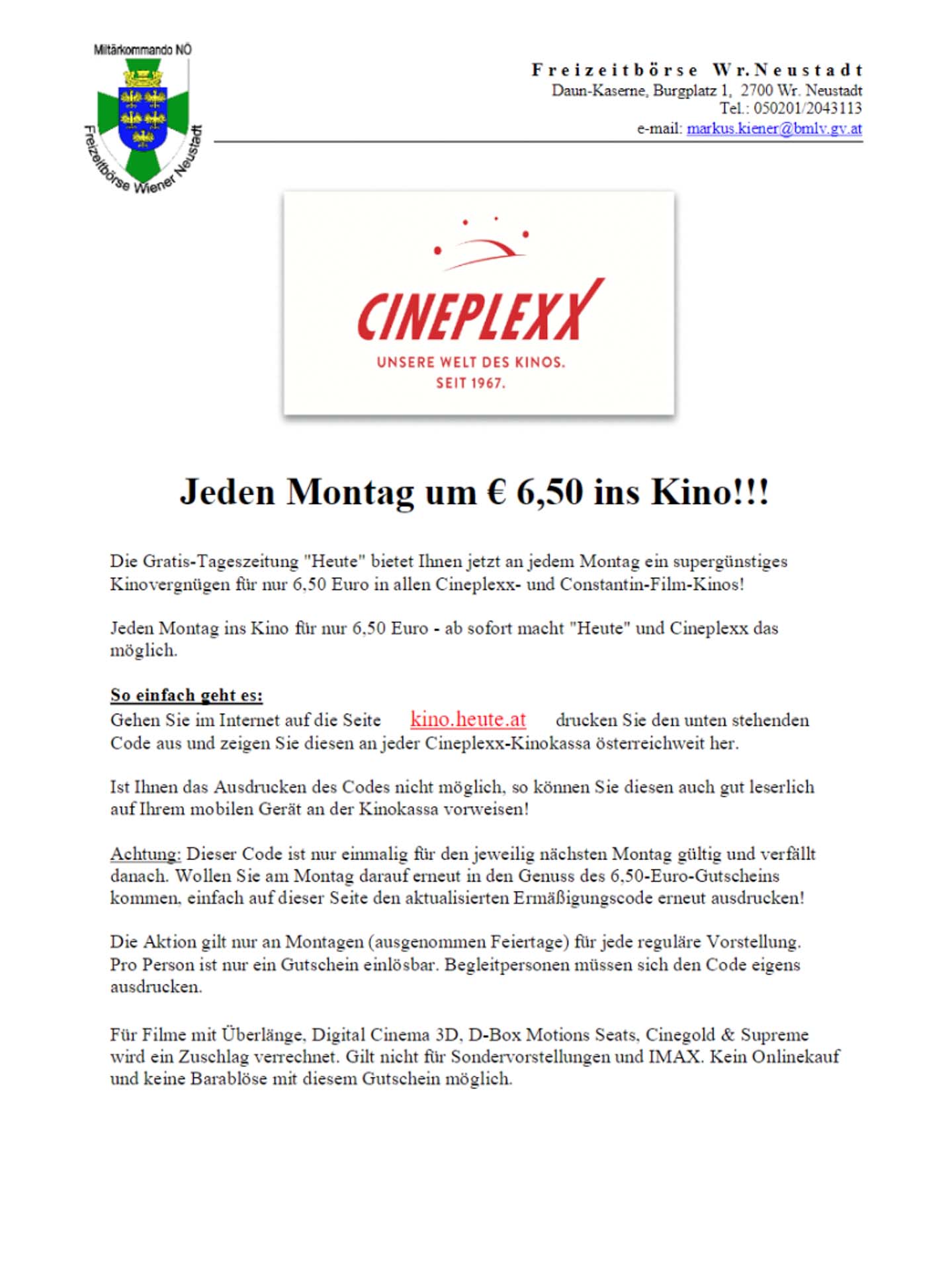 Die Gratis-Tageszeitung "Heute" bietet Ihnen jetzt an jedem Montag ein supergünstiges Kinovergnügen für nur 6,50 Euro in allen Cineplexx- und Constantin-Film-Kinos!