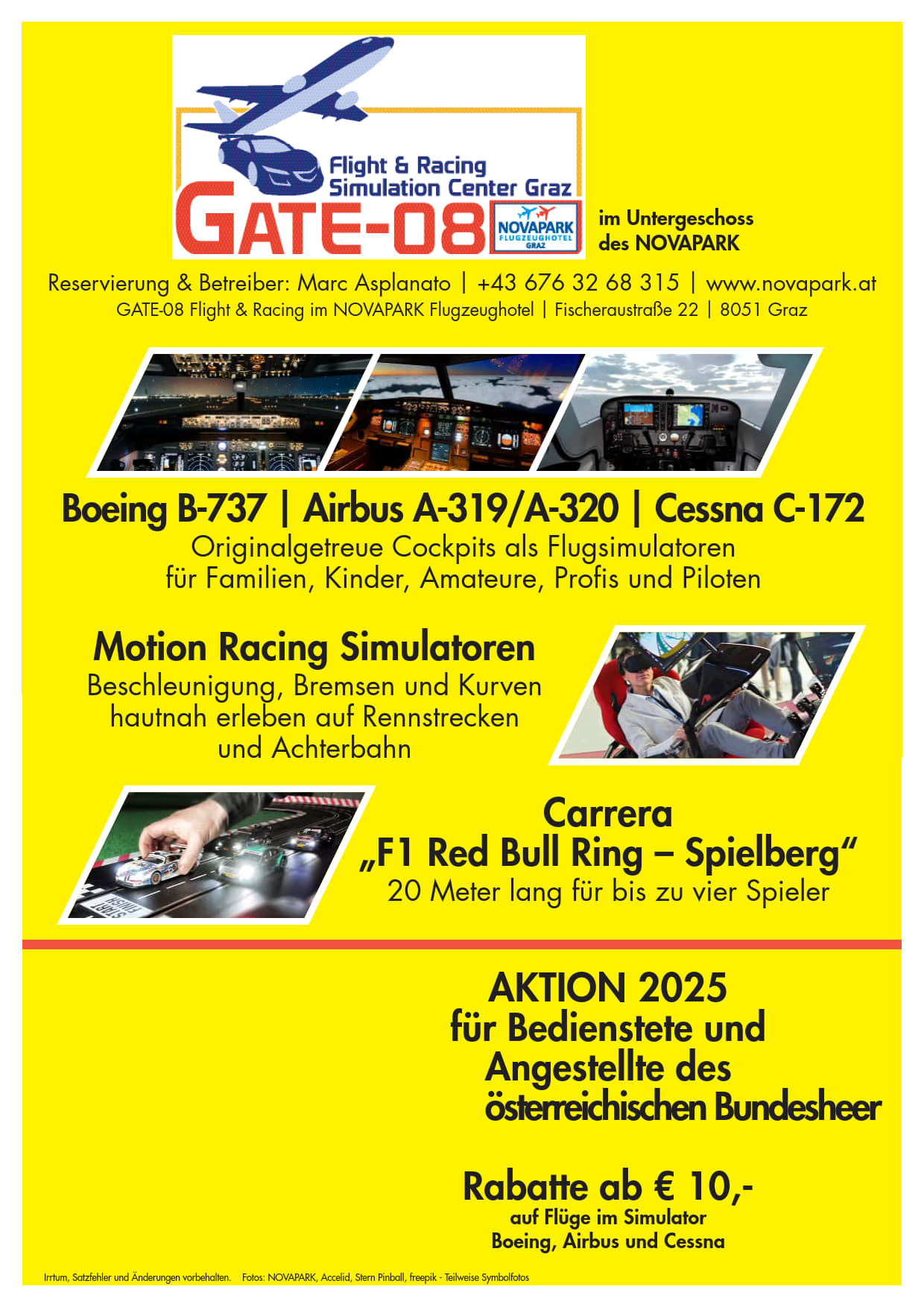 Flight & Racing Simulation Center Graz (im Untergeschoss des Hotel NOVAPARK)Originalgetreue Cockpits als FlugsimulatorenMotion Racing SimulatorenCarrera “F1 Red Bull Ring - Spielberg”