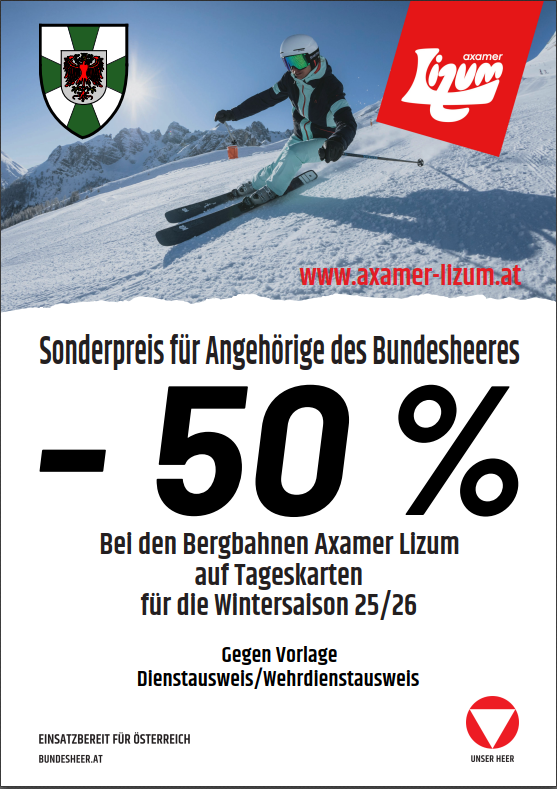 -50% auf Tagestickets für Heeresbedienstete, GWD und Milizsoldaten unter Vorlage des Wehr- bzw. Dienstausweises.