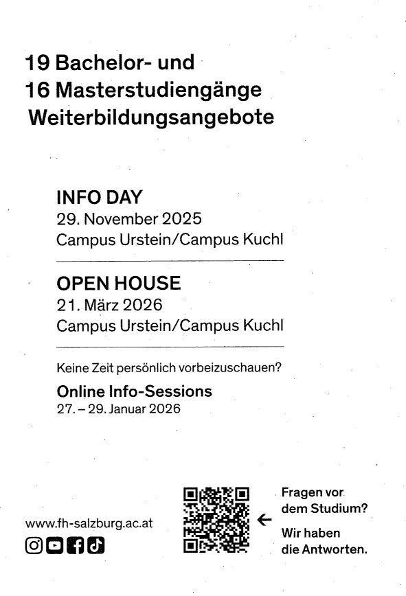 Das MilKdo S / Ref Truppenbetreuung und Familienbetreuung informiert darüber, dass am 29. November der Info Day der FH Salzburg an den Standorten Campus Urstein und Campus Kuchl von 0900 bis 1400 Uhr stattfindet. Unter dem Motto ,,Bright futures in the making“ sind alle Studieninteressierten Rekruten und Bedienstete des ÖBH herzlich eingeladen.