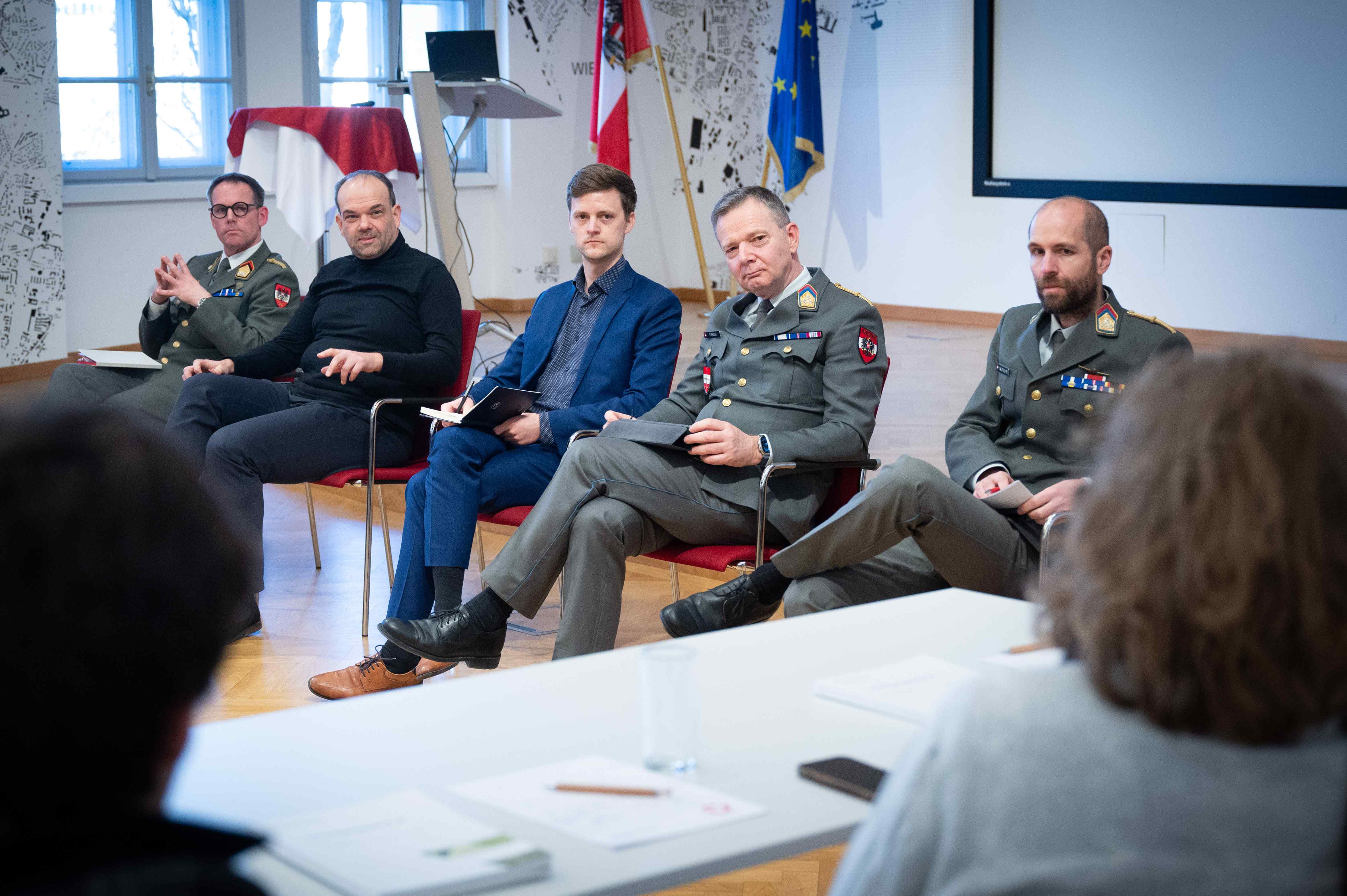 Den Abschluss der Veranstaltung bildete eine Expertenrunde mit renommierten Fachleuten, die unter der Moderation von ObstdhmfD Mag. Hikes-Wurm zentrale sicherheitspolitische Fragen diskutierten. Zu den Experten zählten Dr. Michael Böheim (WIFO), ObstltdG Mag. Hermann Steinkogler (stellvertretender Leiter der Abteilung Militärpolitik), ObstdhmfD Mag. Anton Dengg (Leiter Institut für Friedenssicherung und Konfliktmanagement) und Michael Zinkanell, M.A (Direktor AIES). Die Diskussion bot wertvolle Einblicke in aktuelle sicherheitspolitische Herausforderungen und ermöglichte den Teilnehmerinnen und Teilnehmern einen vertieften Einblick in die strategischen Prozesse des BMLV. Der Besuch des Jungen Forums der Görres-Gesellschaft im BMLV stellte eine bereichernde Plattform für den Austausch zwischen Wissenschaft, Politik und Praxis dar und verdeutlichte die Relevanz strategischer Vorausschau in einer sich wandelnden sicherheitspolitischen Landschaft.