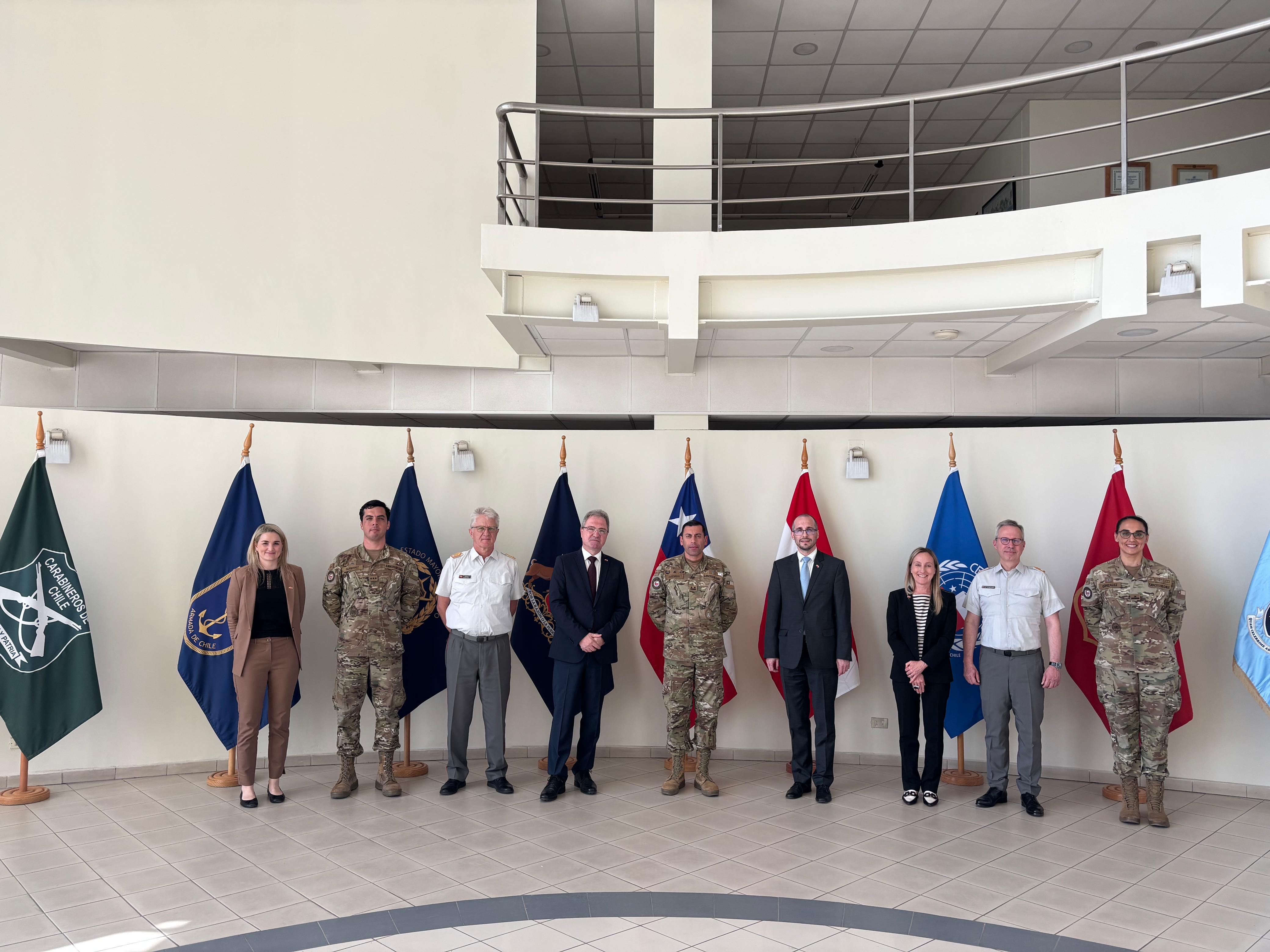 Anschließend ging es für die österreichische Delegation weiter in das “Nationale Institut für Politische und Strategische Studien”, wo Dr. Kammel einen Vortrag über die Sicherheits- und Verteidigungspolitik Europas hielt. Außerdem wurde dem Peacekeeping Center des chilenischen Militärs, “Centro Conjunto para Operaciones de Paz de Chile” (CECOPAC) ein Besuch abgestattet.